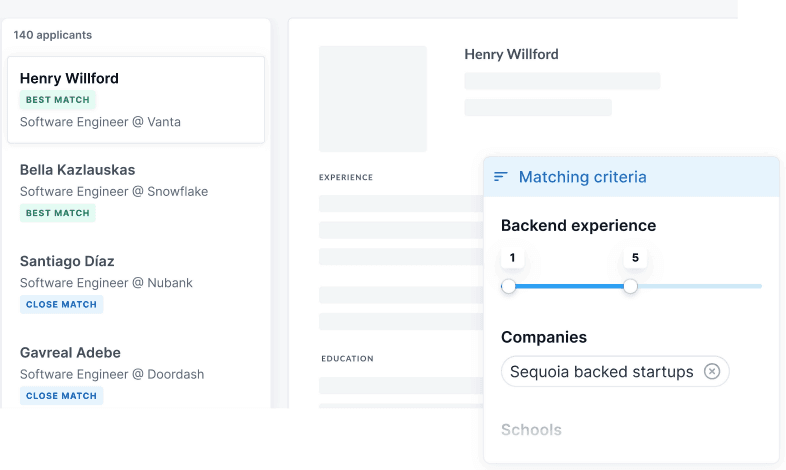 AI scoring: Resumes rank top-to-bottom against custom filters so hiring managers skim the best candidates first.