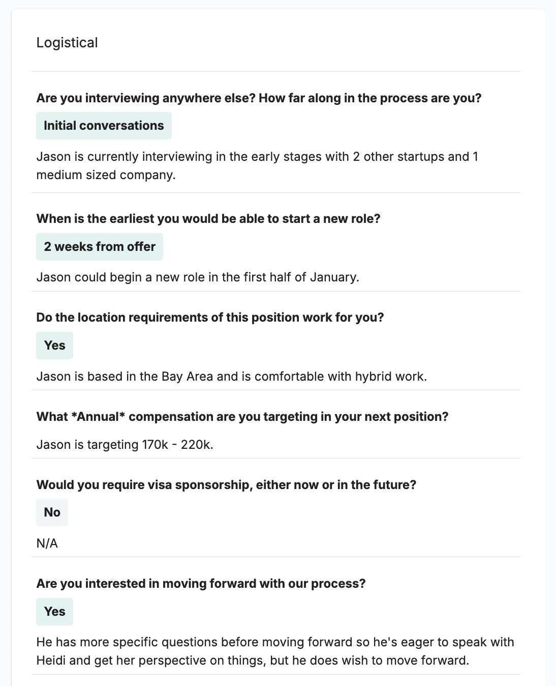 Standard logistical questions that Dover Interviewers use during phone screens.