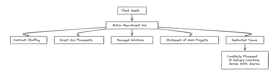 Motion Recruitment operates as an IT staffing agency that focuses on tech recruitment across 16 North American cities. They deliver IT talent solutions through four main service areas: contract staffing, direct hire placements, managed solutions, and statement of work projects.
