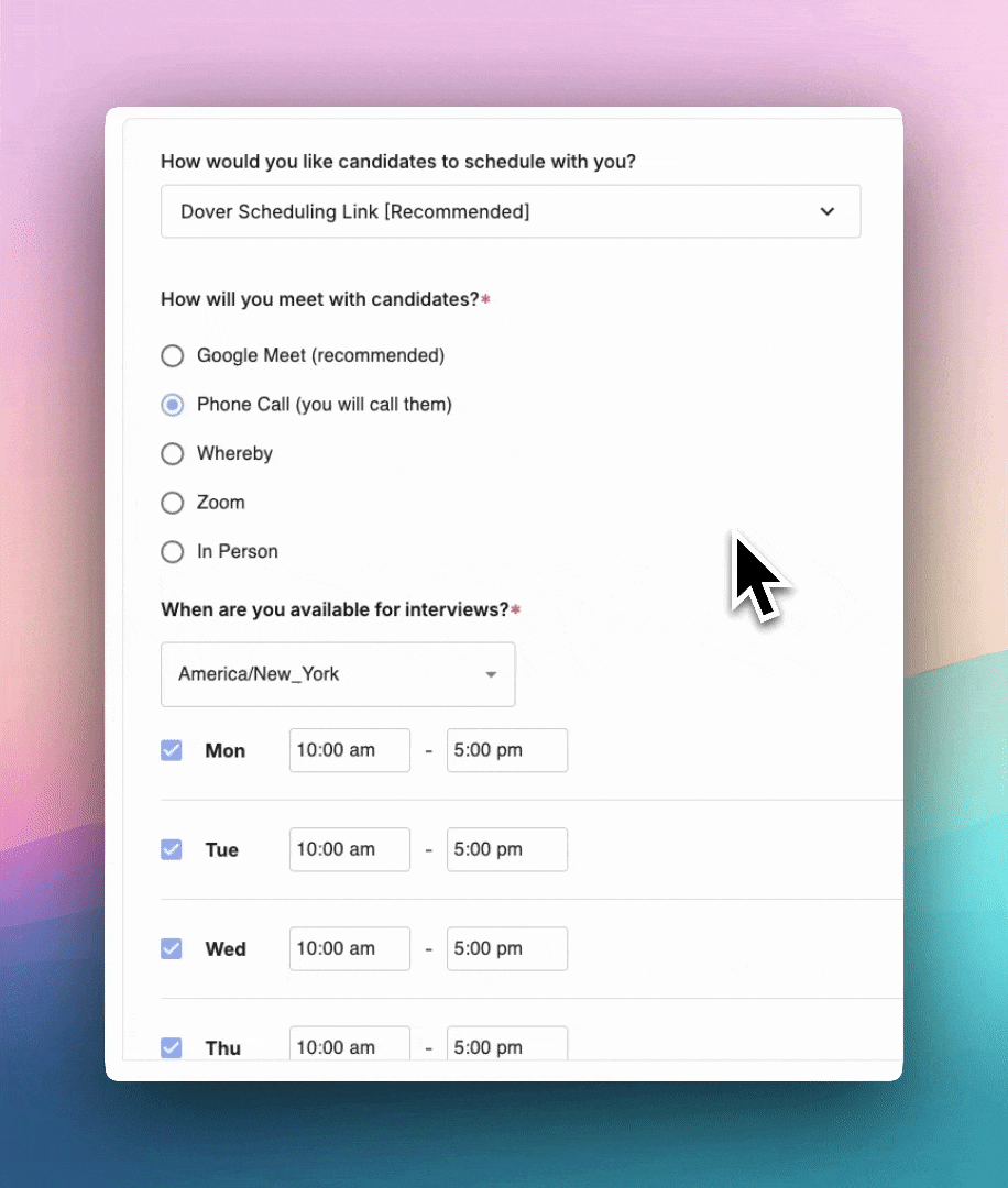 As companies embrace return-to-office policies, we've added an in-person scheduling option. Candidates will automatically see your office location in their calendar invites, eliminating back-and-forth emails about meeting details. Plus, we've added weekend availability, giving you and your candidates more flexibility to find the perfect interview time and place.