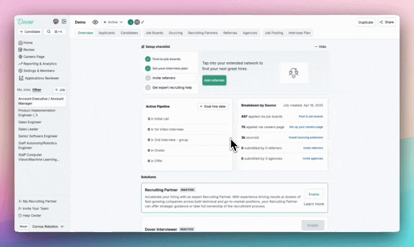 You can now import your Dover ATS jobs to Y Combinator's Work at a Startup in seconds, and automatically sync new YC applicants right back into Dover. Job descriptions are synced from Dover, and applicants from WaaS show up in the ATS instantly.