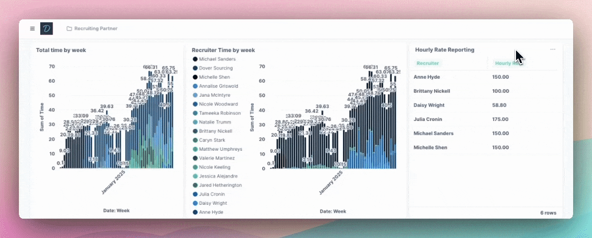 When you work with our fractional recruiters, you can now see which recruiters are working on your roles, their hourly rates, and time logged in Reporting & Analytics > Recruiting Partner. Complete transparency means you always know where your recruiting budget is going and can make informed decisions about your hiring spend.