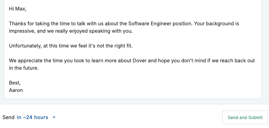 Often, you want to reject a candidate right after an interview but don’t want an email to go out immediately. Now you can queue a rejection email to be sent the following day.