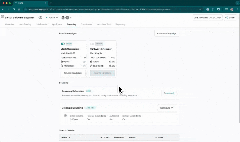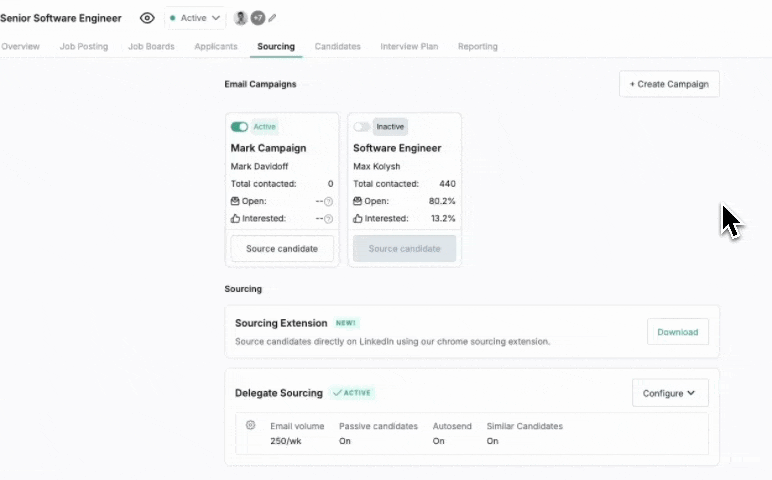 We put all your Sourcing tools in one place. Create email campaigns, install our Sourcing Extension, and source candidates — all from a single tab.