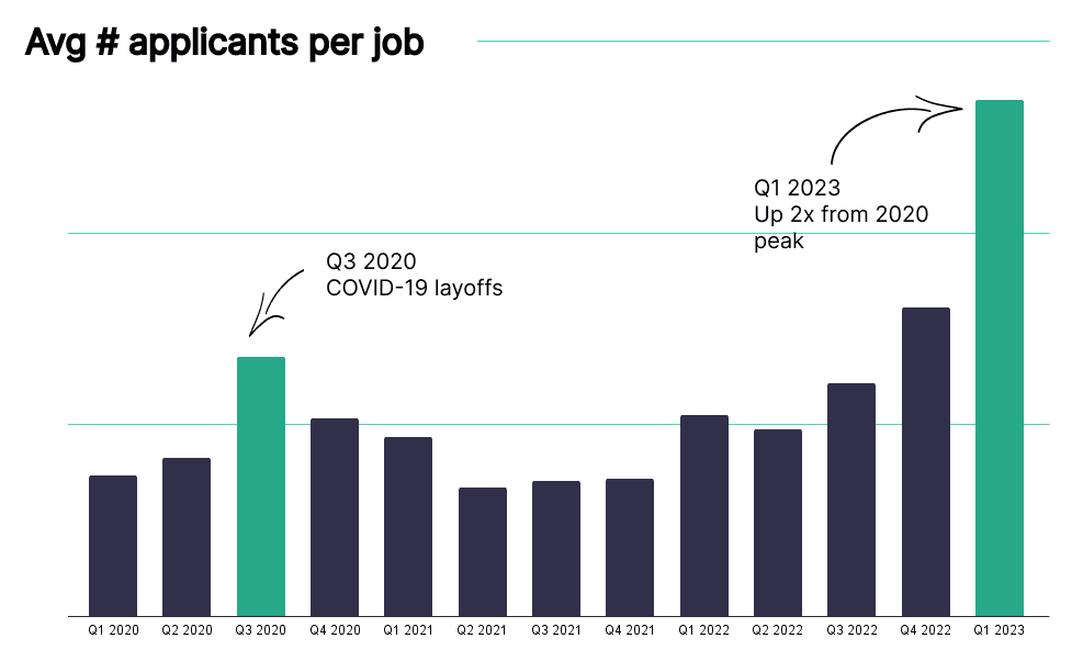 In 2023, employers saw a large spike in applicant volume. Data from Dover users showed that 2023 applications were up 2x from the peak in 2020.