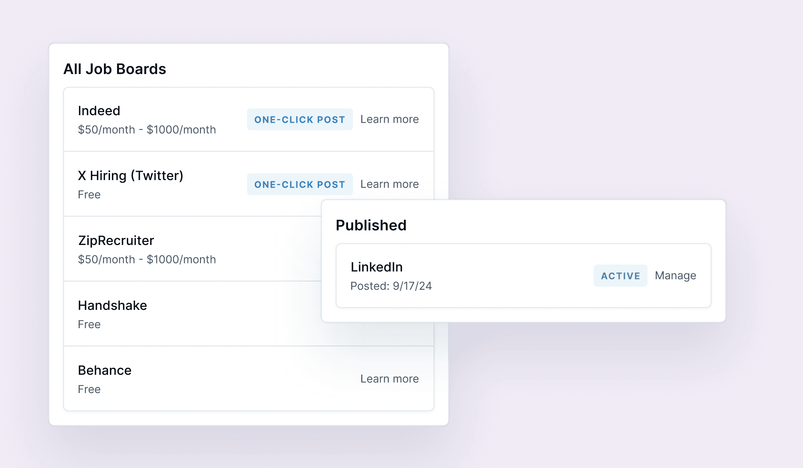 ⟡ One-click posting to LinkedIn, Indeed, and X