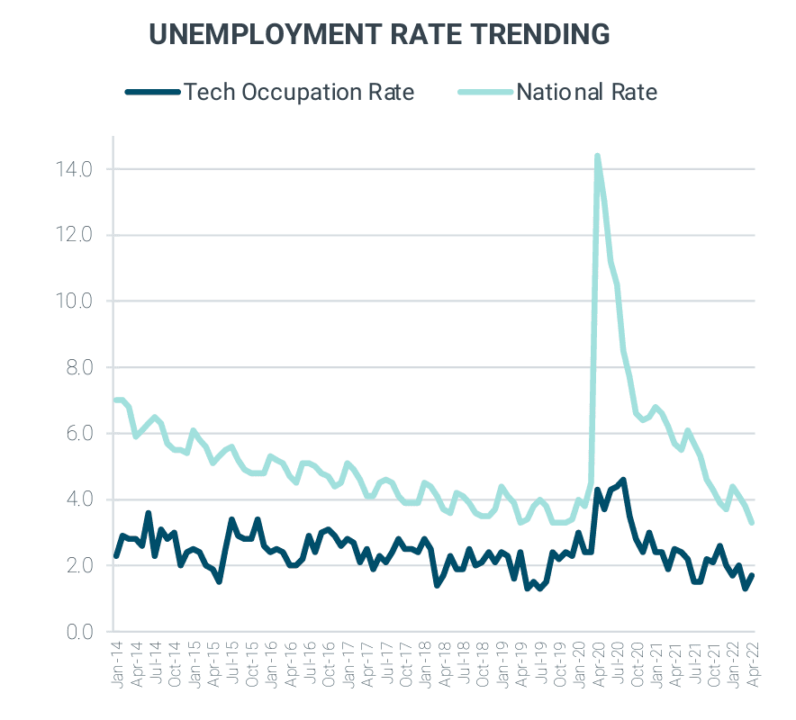 If you’re a founder or work in talent acquisition for startups, you know that despite the COVID-19 pandemic and the Great Resignation, the tech industry bounced back quickly. The unemployment rate for tech jobs is 1.3%, its lowest level since June 2019 and about one-third of the national rate. As more startups open up their talent pool by adopting hybrid or remote work models, the projected growth rate for tech jobs over the next decade is near twice the national jobs rate.