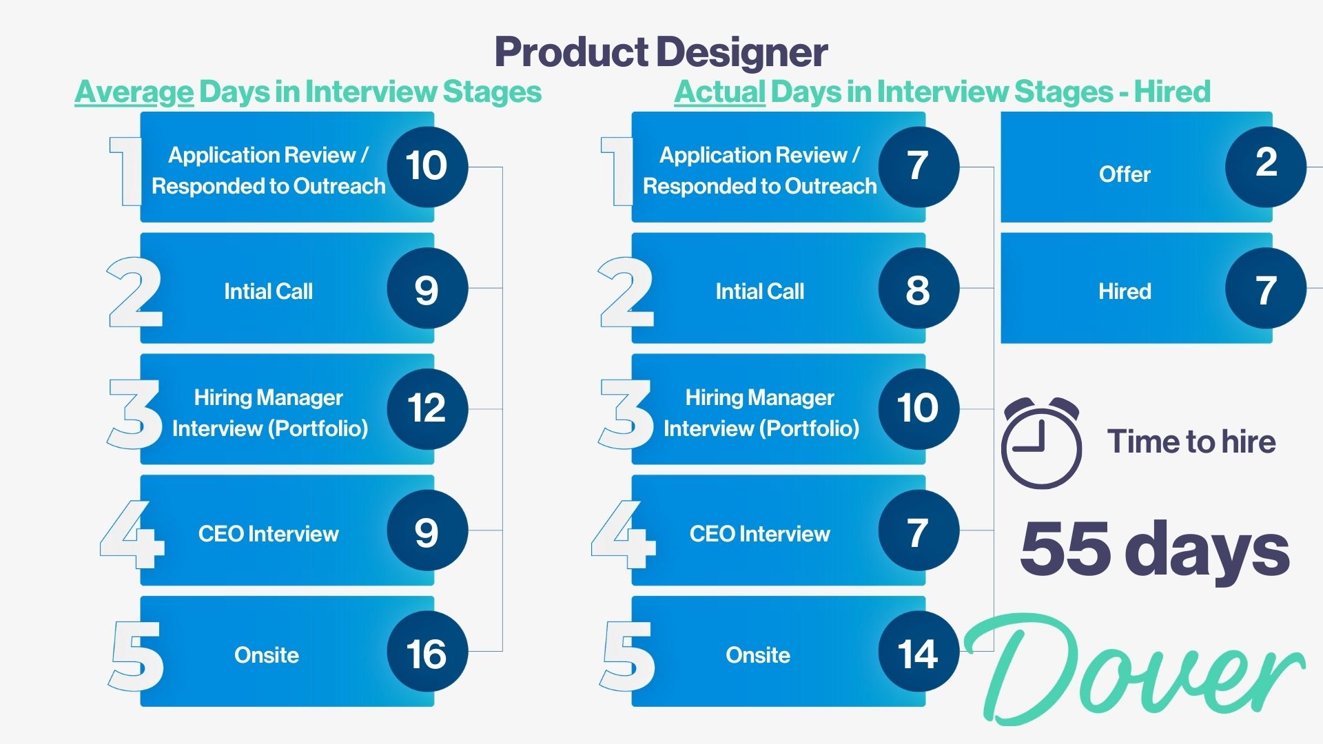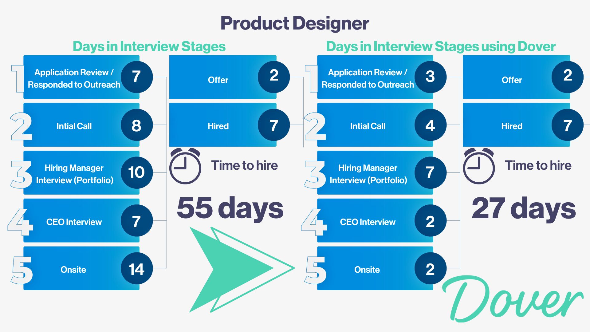 At Dover, we offer scheduling tools and automations to significantly decrease your time-to-hire. For the Product Designer example, using Dover could have reduced the time-to-hire from 55 days to 27 days.