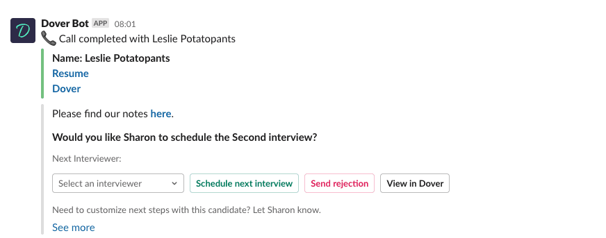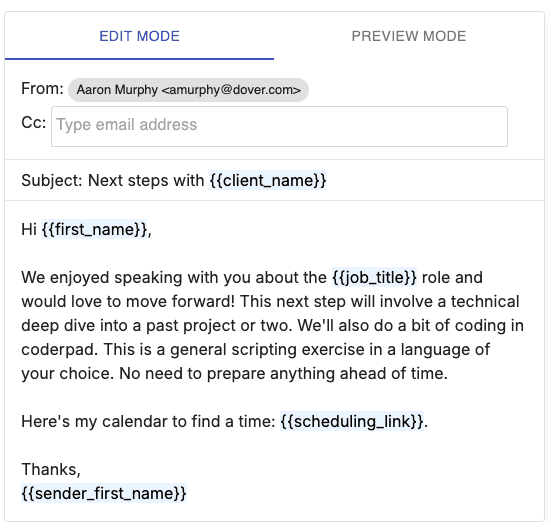 💡 At Dover, we recommend informing candidates about next steps during an interview or immediately after their interview. We also suggest including a scheduling link for candidates to book their next round to cut down on the back-and-forth emails.