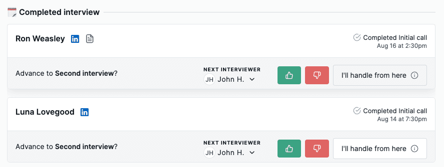 After candidates complete an interview, the interviewer should know pretty quickly whether the candidate should be advanced or not. Hiring teams can review interview notes and make decisions about candidates directly in Slack or in our web app.