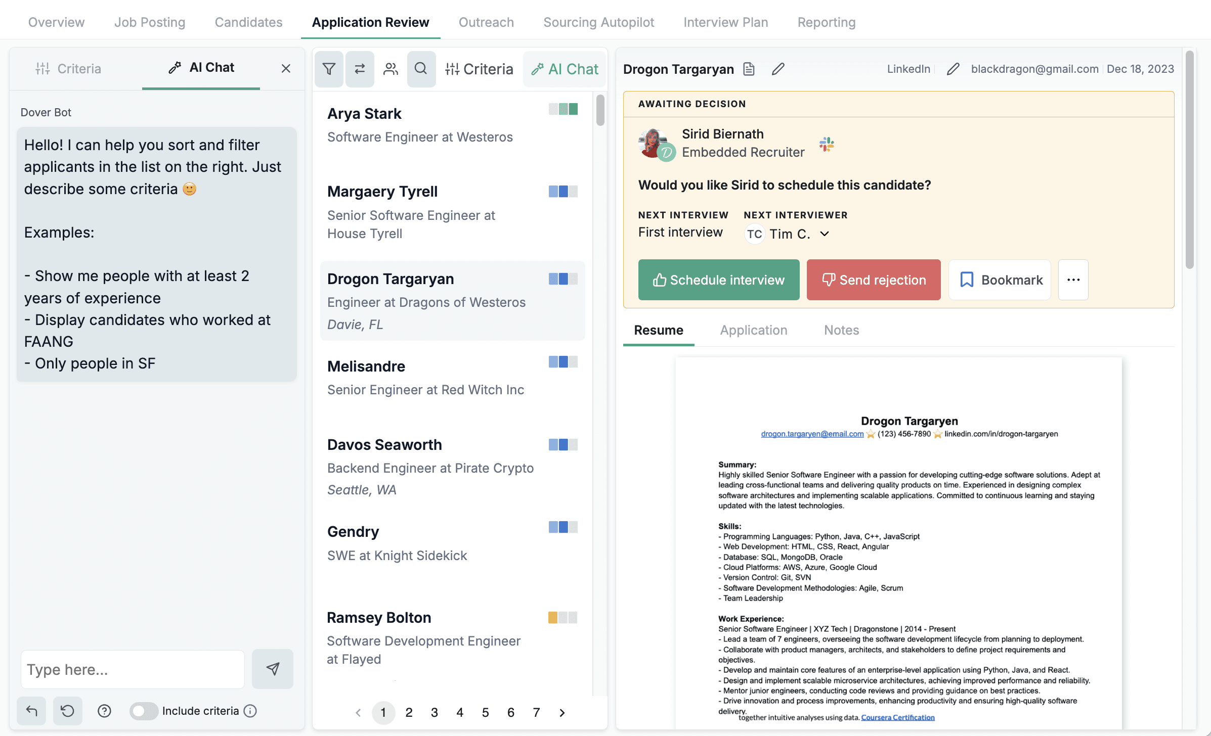 Dover posts your open position on multiple job boards. When job seekers apply to your job post, Dover's AI applicant sorting shows you good candidates for the position. You can quickly review ranked applicants and bulk reject and politely email those applicants who do not match your job description. Review and send an interview scheduling email to qualified applicants with the click of a button.