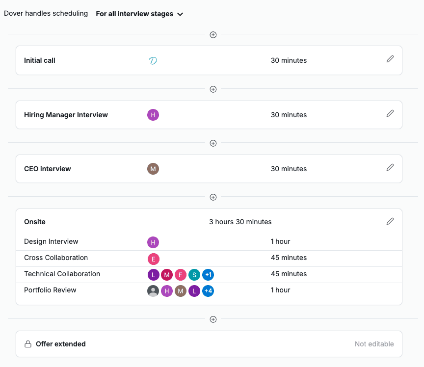 Ideally, interview plans should only be as long as is necessary to properly evaluate whether a candidate is a good fit for the role. Too many stages will increase time-to-hire and may result in candidates dropping off. Too few stages and neither the hiring team nor the candidate can determine if they are a good fit for the role. Ad Dover, we recommend a hard cap of five interview stages including any assessments like take home assignments. Anything longer than five interview stages will result in significant drop-off rates.