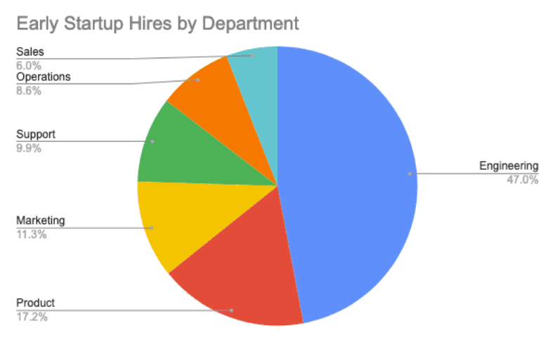 It makes intuitive sense that close to two-thirds of early startup hires are in either Engineering or Product since you have to build the product before you have a product to market, sell, and support.