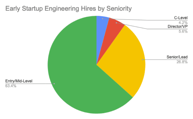 You can see the relative inexperience of startup hires reflected in their job titles as well: our analysis found that only 10% of early Engineering hires are at the director/VP or C-Suite level. At the same time, almost two-thirds were entry- or mid-level (meaning they had “senior,” “lead,” or “director” attached to their title).