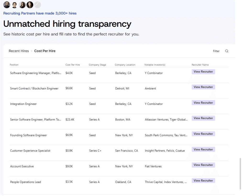 Specialized expertise | Network includes recruiters specializing in specific roles (engineering, sales, marketing) and industries (fintech, healthcare, SaaS) who understand your unique hiring challenges. |