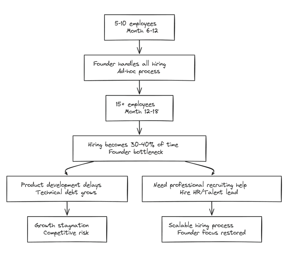The breaking point typically arrives around 15 employees when you're planning to hire 8-10 more people in the coming months. Recruiting suddenly demands 30-40% of your time, pulling you away from product development and business strategy in ways that hurt company growth.