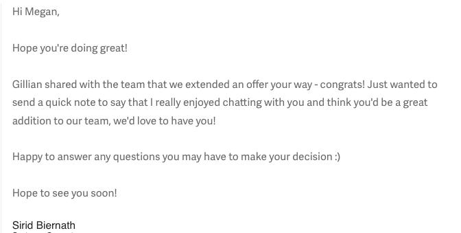 Thoughtful recruiting process: At other startups without a recruiting team or strategy in place, I experience disorganized, and at times, unprofessional behavior. On two separate occasions, an interviewer simply didn't show up. Throughout Dover’s entire interview process, and thanks in part to the product, I received thoughtful and timely follow-ups and felt that everyone really wanted to get to know me.