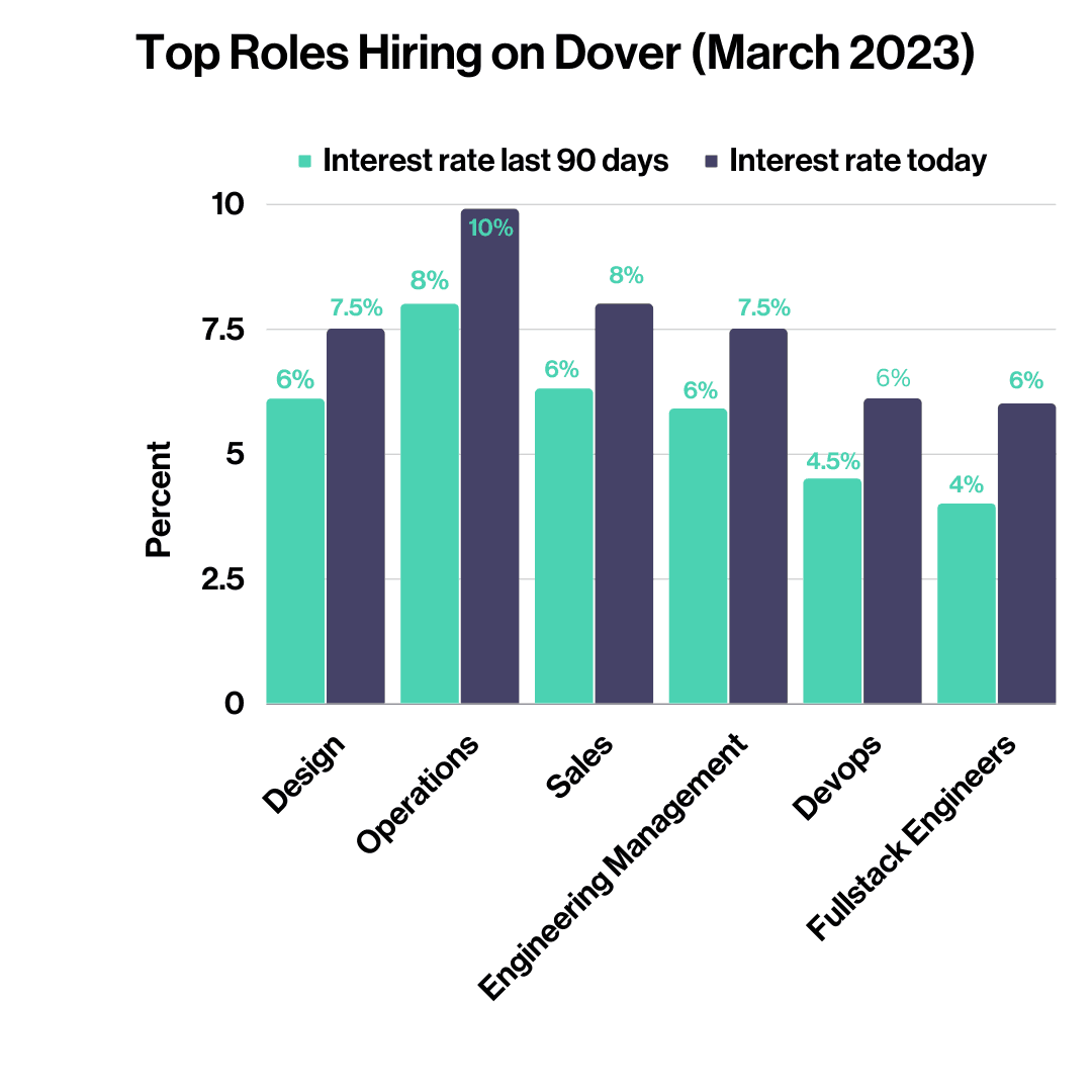 Dover’s internal data shows that candidates are more engaged than ever before: The average interest rate for top roles hiring in tech — think product, engineering, and bizops — has doubled since the economy started to dip in June 2022. (Note: Dover measures interest rate as the % candidates who respond with interest to an initial email)