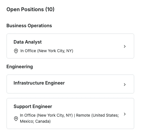 Transform your careers page into a candidate-friendly experience by grouping jobs by department, location, or any other category. This intuitive organization helps job seekers quickly find relevant positions and creates a more professional impression of your hiring process.