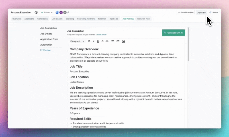 Hiring multiple people for similar roles? With one click, you can duplicate the job’s hiring team, sourcing outreach campaigns, job description, application form, and interview plan. Keep your hiring metrics like time-to-hire accurate while spinning up similar roles in seconds.